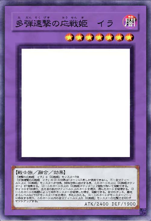 | 「速撃の応戦姫 イラ」+「応戦姫」モンスター1体 「多弾連撃の応戦姫 イラ」の(3)の効果は1ターンに1度しか使用できない。(1):自分フィールド上に「応戦姫」モンスターが召喚、特殊召喚に成功する度、このカードの上に「応戦姫カウンター」を1個乗せる。(2):このカードの上の「応戦姫カウンター」2個取り除いて発動できる。サイコロを1回振り、出た目の数だけフィールド上のカードを選び、選んだカードを破壊する。(3):このカードの戦闘によって相手モンスターを破壊した場合、発動できる。自分のデッキ、墓地からレベル4以下のPモンスター1体を選び、手札に加える。(4):このカードがモンスターゾーンに存在する限り、このカード以外の自分フィールド上の「応戦姫」モンスターの攻撃力を400ポイントアップする。 | |||