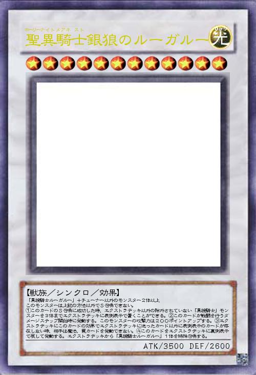 | 「異貌騎士ルーガルー」+チューナー以外のモンスター2体以上 このモンスターは上記の方法以外でS召喚できない。 ①このカードのS召喚に成功した時、エクストラデッキ以外の除外されていない「異貌騎士」モンスターを3体までエクストラデッキに表側表示で置くことができる。②このカードが戦闘を行うダメージステップ開始時に発動する。このモンスターの攻撃力は200ポイントアップする。③エクストラデッキにこのカードの効果でエクストラデッキに送ったカード以外に表側表示のカードが存在しない時、相手は魔法、罠カードを発動できない。④このカードをエクストラデッキに裏側表示で戻して発動する。エクストラデッキから「異貌騎士ルーガルー」1体を特殊召喚する。 | |||