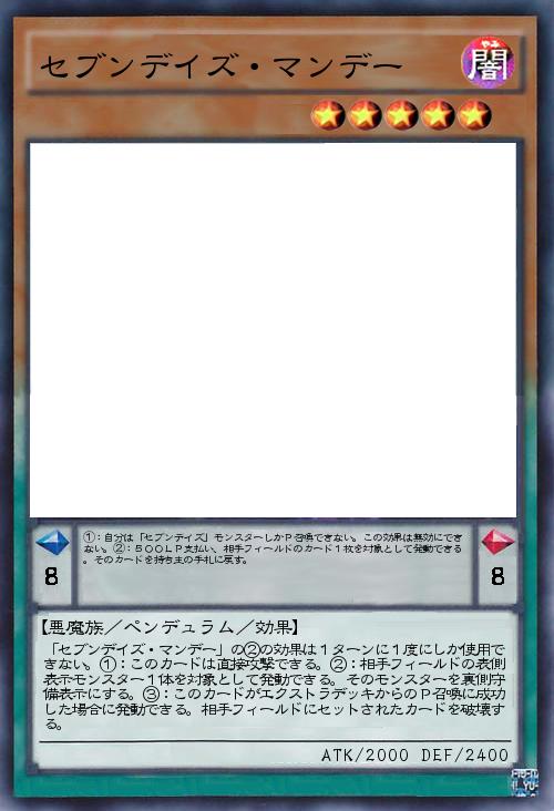 | 「セブンデイズ・マンデー」の②の効果は1ターンに1度にしか使用できない。①:このカードは直接攻撃できる。②:相手フィールドの表側表示モンスター1体を対象として発動できる。そのモンスターを裏側守備表示にする。③:このカードがエクストラデッキからのP召喚に成功した場合に発動できる。相手フィールドにセットされたカードを破壊する。 | |||
