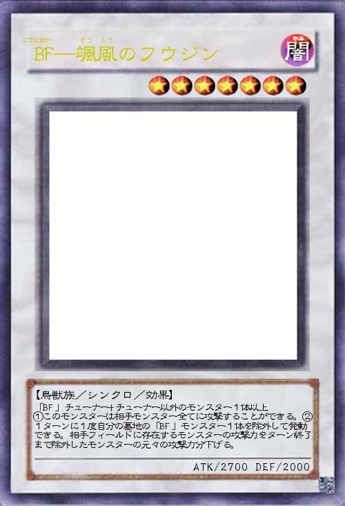 | 「BF」チューナー+チューナー以外のモンスター1体以上 ①このモンスターは相手モンスター全てに攻撃することができる。②1ターンに1度自分の墓地の「BF」モンスター1体を除外して発動できる。相手フィールドに存在するモンスターの攻撃力をターン終了まで除外したモンスターの元々の攻撃力分下げる。 | |||