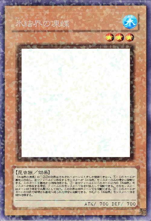 | 「氷結界の凍蝶」の①②③の効果はそれぞれ1ターンに1度しか使用できない。①:このカードが墓地に存在し、自分フィールドに存在するモンスターが「氷結界」モンスターのみの場合に発動できる。このカードを墓地から特殊召喚する。②:自分フィールドにこのカード以外の「氷結界」モンスターが存在する場合、フィールドのモンスター1体を対象として発動できる。そのモンスターはターン終了時まで水属性として扱う。この効果は相手ターンでも発動できる。③:このカードがカードの効果で破壊され墓地へ送られた場合に発動できる。手札から「氷結界」モンスター1体を特殊召喚する。 | |||