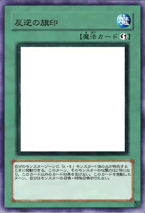 | 自分のモンスターゾーンに「A・R」モンスター1体のみが存在するときに発動できる。このターン、そのモンスターの攻撃力は2倍になり、このカード以外のカード効果を受けない。このカードを発動したターン、自分はモンスターの召喚・特殊召喚を行えない。 | |||