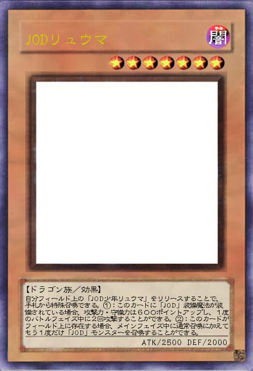 | 自分フィールド上の「JOD少年リュウマ」をリリースすることで、手札から特殊召喚できる。①:このカードに「JOD」装備魔法が装備されている場合、攻撃力・守備力は600ポイントアップし、1度のバトルフェイズ中に2回攻撃することができる。②:このカードがフィールド上に存在する場合、メインフェイズ中に通常召喚に加えてもう1度だけ「JOD」モンスターを召喚することができる。 | |||