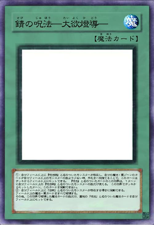 | ①:自分フィールド上に『呪法師』と名のついたモンスターが存在し、自分の魔法・罠ゾーンのカードが自分フィールド上のモンスターの数より少ない時、手札を一枚捨てることで、このカードはデッキからフィールド上にセットできる。 『呪法』と名のついたカードのこの効果は、1ターンに自分フィールド上の『呪法師』と名のついたモンスターの数だけ使える。 この効果でデッキからセットしたターン、このカードを発動できない。 ②:自分フィールド上に「法師」と名のついたモンスターが存在する場合に発動できる。 フィールド上の魔法・罠カードをすべて破壊する。 その後、この効果で破壊した魔法カードの数だけ、墓地の「呪法」と名のついた魔法カードを自分フィールド上にセットできる。 | |||
