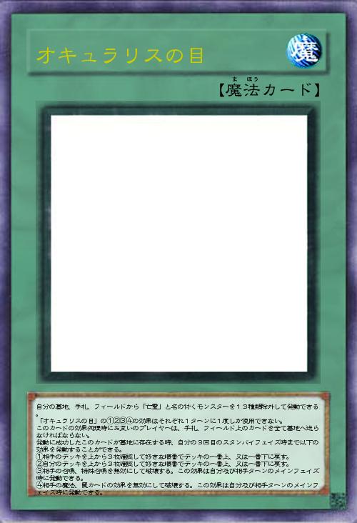 | 自分の墓地、手札、フィールドから「亡霊」と名の付くモンスターを13種類除外して発動できる。 「オキュラリスの目」の①②③④の効果はそれぞれ1ターンに1度しか使用できない。 このカードの効果処理時にお互いのプレイヤーは、手札、フィールド上のカードを全て墓地へ送らなければならない。 発動に成功したこのカードが墓地に存在する時、自分の3回目のスタンバイフェイズ時まで以下の効果を発動することができる。 ①相手のデッキを上から3枚確認して好きな順番でデッキの一番上、又は一番下に戻す。 ②自分のデッキを上から3枚確認して好きな順番でデッキの一番上、又は一番下に戻す。 ③相手の召喚、特殊召喚を無効にして破壊する。この効果は自分及び相手ターンのメインフェイズ時に発動できる。 ④相手の魔法、罠カードの効果を無効にして破壊する。この効果は自分及び相手ターンのメインフェイズ時に発動できる。 | |||