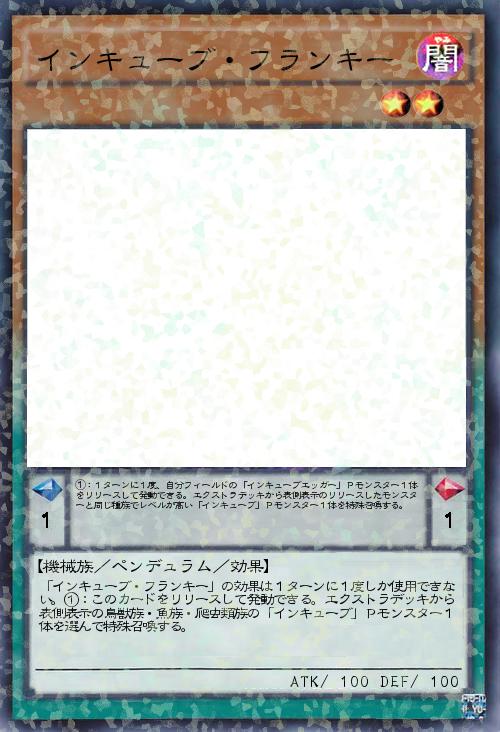 | 「インキューブ・フランキー」の効果は1ターンに1度しか使用できない。①:このカードをリリースして発動できる。エクストラデッキから表側表示の鳥獣族・魚族・爬虫類族の「インキューブ」Pモンスター1体を選んで特殊召喚する。 | |||