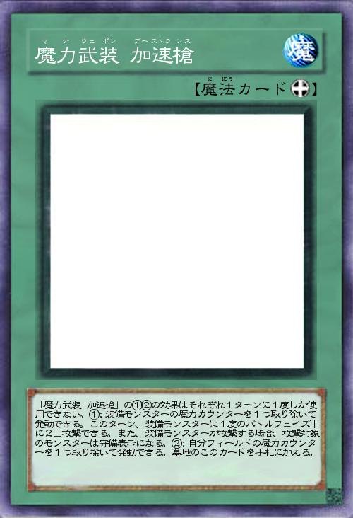 | 「魔力武装 加速槍」の①②の効果はそれぞれ1ターンに1度しか使用できない。①:装備モンスターの魔力カウンターを1つ取り除いて発動できる。このターン、装備モンスターは1度のバトルフェイズ中に2回攻撃できる。また、装備モンスターが攻撃する場合、攻撃対象のモンスターは守備表示になる。②:自分フィールドの魔力カウンターを1つ取り除いて発動できる。墓地のこのカードを手札に加える。 | |||