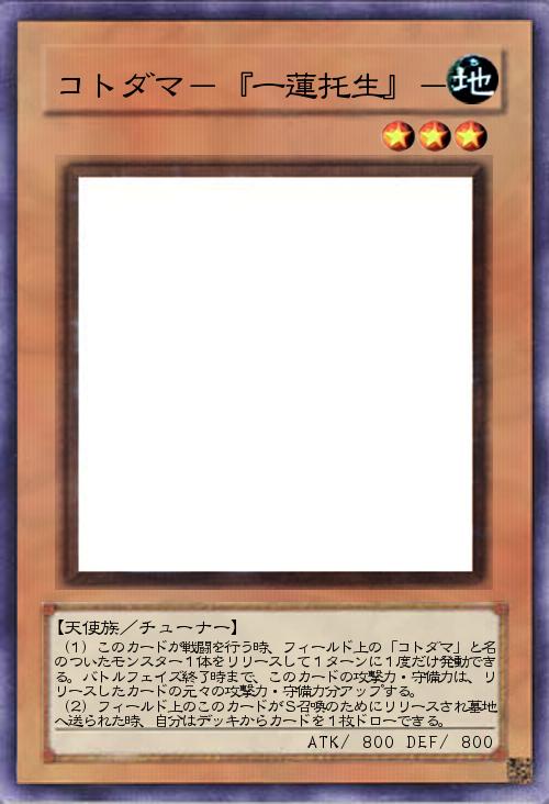 | (1)このカードが戦闘を行う時、フィールド上の「コトダマ」と名のついたモンスター1体をリリースして1ターンに1度だけ発動できる。バトルフェイズ終了時まで、このカードの攻撃力・守備力は、リリースしたカードの元々の攻撃力・守備力分アップする。 (2)フィールド上のこのカードがS召喚のためにリリースされ墓地へ送られた時、自分はデッキからカードを1枚ドローできる。 | |||