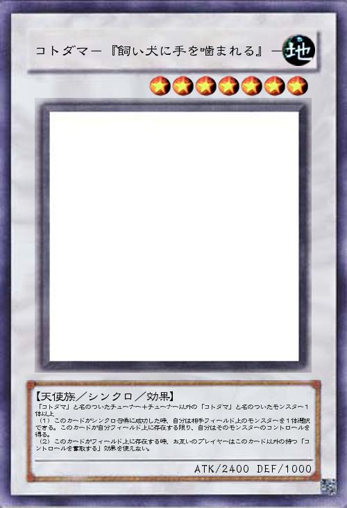 | 「コトダマ」と名のついたチューナー+チューナー以外の「コトダマ」と名のついたモンスター1体以上 (1)このカードがシンクロ召喚に成功した時、自分は相手フィールド上のモンスターを1体選択できる。このカードが自分フィールド上に存在する限り、自分はそのモンスターのコントロールを得る。 (2)このカードがフィールド上に存在する時、お互いのプレイヤーはこのカード以外の持つ「コントロールを奪取する」効果を使えない。 | |||