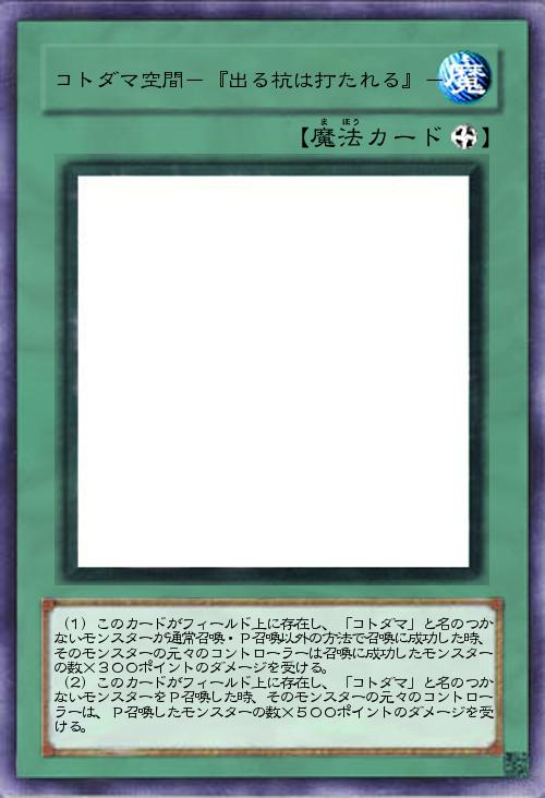ついに出ましたコトダマ魔法カード!今回は超強力なフィールド魔法です。ぶっちゃけ強すぎる気がしないでもないですが・・・まあ自分もコトダマ以外のモンスター使いづらくなるから良いかな。効果としては自他問わず「出る杭は打たれる」っぽくしてあります。