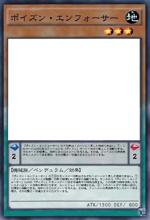 | 「ポイズン・エンフォーサー」の①②のモンスター効果はそれぞれ1ターンに1度しか使用できない。①:フィールドのこのカードが戦闘・効果で破壊された場合に発動できる。デッキから「ポイズン・エンフォーサー」以外の「ポイズン」Pモンスター1体を守備表示で特殊召喚する。この効果で特殊召喚したモンスターはS・X召喚の素材にできず、エンドフェイズに破壊される。②:このカードがP召喚に成功した場合に発動できる。相手に300ダメージを与える。その後、フィールドの表側表示モンスター1体を選び、その攻撃力・守備力を300ダウンする。 | |||