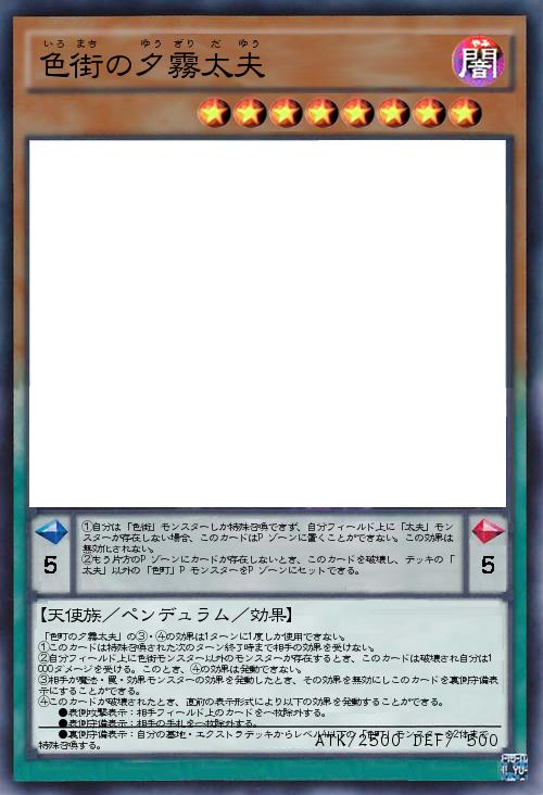 | 「色町の夕霧太夫」の③・④の効果は1ターンに1度しか使用できない。 ①このカードは特殊召喚された次のターン終了時まで相手の効果を受けない。 ②自分フィールド上に色街モンスター以外のモンスターが存在するとき、このカードは破壊され自分は1000ダメージを受ける。このとき、④の効果は発動できない。 ③相手が魔法・罠・効果モンスターの効果を発動したとき、その効果を無効にしこのカードを裏側守備表示にすることができる。 ④このカードが破壊されたとき、直前の表示形式により以下の効果を発動することができる。 ●表側攻撃表示:相手フィールド上のカードを一枚除外する。 ●表側守備表示:相手の手札を一枚除外する。 ●裏側守備表示:自分の墓地・エクストラデッキからレベル4以下の「色町」モンスターを2体まで特殊召喚する。 | |||