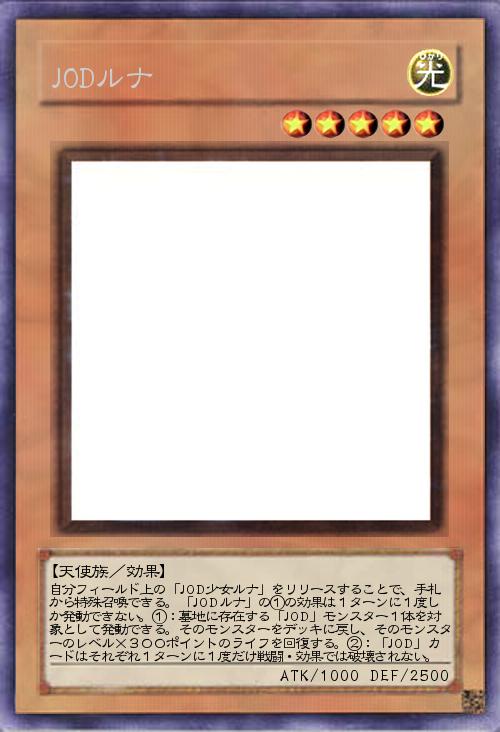 | 自分フィールド上の「JOD少女ルナ」をリリースすることで、手札から特殊召喚できる。「JODルナ」の①の効果は1ターンに1度しか発動できない。①:墓地に存在する「JOD」モンスター1体を対象として発動できる。そのモンスターをデッキに戻し、そのモンスターのレベル×300ポイントのライフを回復する。②:「JOD」カードはそれぞれ1ターンに1度だけ戦闘・効果では破壊されない。 | |||