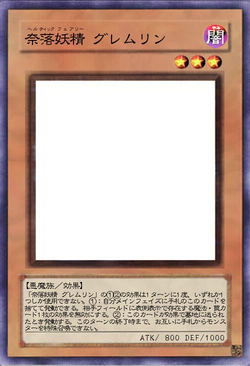 | 「奈落妖精 グレムリン」の①②の効果は1ターンに1度、いずれか1つしか使用できない。①:自分メインフェイズに手札のこのカードを捨てて発動できる。相手フィールドに表側表示で存在する魔法・罠カード1枚の効果を無効にする。②:このカードが効果で墓地に送られたとき発動する。このターンの終了時まで、お互いに手札からモンスターを特殊召喚できない。 | |||