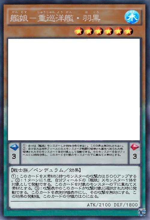 | ①:自分は「艦娘」モンスターしか特殊召喚できない。この効果は無効化されない。②:自分または相手フィールドのXモンスターが戦闘で破壊され墓地へ送られた時、破壊されたそのモンスター1体を対象として発動できる。そのモンスターを自分フィールドに特殊召喚し、このカードを対象のモンスターの下に重ねてX素材とする。 | |||