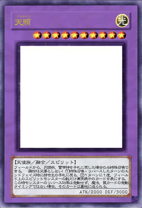 | フィールドから、月読命、雷帝神を手札に戻した場合のみ特殊召喚できる。(融合は必要としない)①特殊召喚・リバースしたターンのエンドフェイズ時に持ち主の手札に戻る。②1ターンに1度、フィールド上のスピリットモンスターの数だけ裏側表示のカードを表にする。この時モンスターのリバース効果は発動せず、魔法、罠カードの発動タイミングではない場合、そのカードは墓地に送られる。 | |||