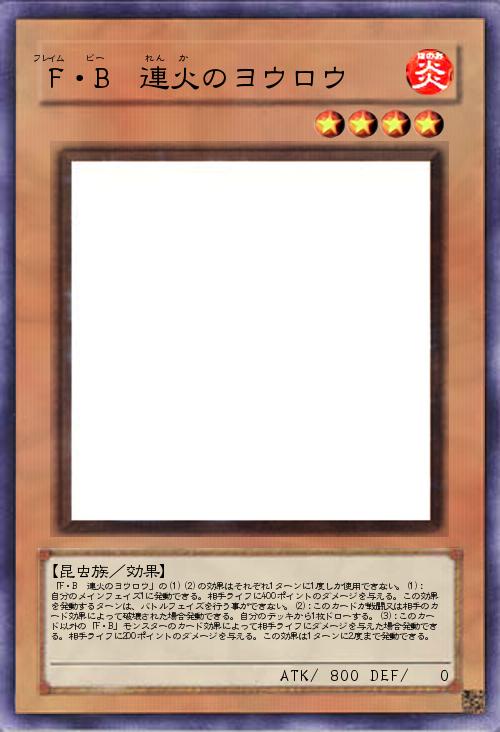 | 「F・B 連火のヨウロウ」の(1)(2)の効果はそれぞれ1ターンに1度しか使用できない。(1):自分のメインフェイズ1に発動できる。相手ライフに400ポイントのダメージを与える。この効果を発動するターンは、バトルフェイズを行う事ができない。(2):このカードが戦闘又は相手のカード効果によって破壊された場合発動できる。自分のデッキから1枚ドローする。(3):このカード以外の「F・B」モンスターのカード効果によって相手ライフにダメージを与えた場合発動できる。相手ライフに200ポイントのダメージを与える。この効果は1ターンに2度まで発動できる。 | |||