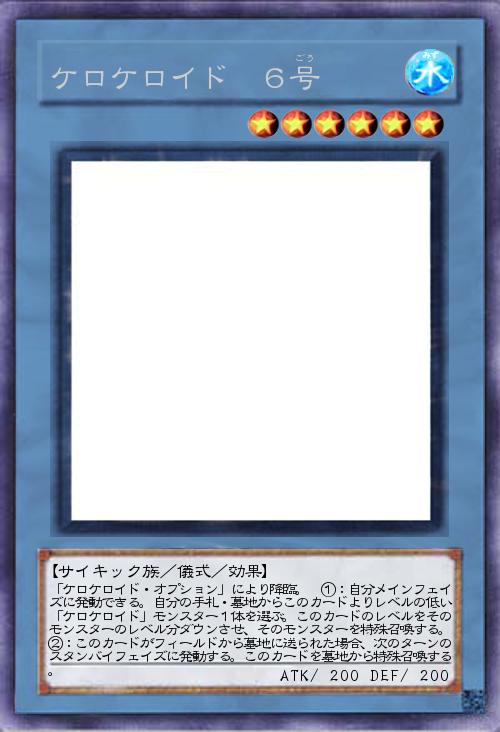 | 「ケロケロイド・オプション」により降臨。 ①:自分メインフェイズに発動できる。自分の手札・墓地からこのカードよりレベルの低い「ケロケロイド」モンスター1体を選ぶ。このカードのレベルをそのモンスターのレベル分ダウンさせ、そのモンスターを特殊召喚する。②:このカードがフィールドから墓地に送られた場合、次のターンのスタンバイフェイズに発動する。このカードを墓地から特殊召喚する。 | |||