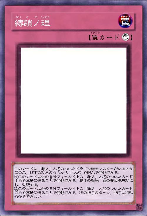 | このカードは「鎖ノ」と名のついたドラゴン族モンスターがいるときにのみ、以下の効果のうちから1つだけを選んで発動できる。 ①このカード以外の自分フィールド上の「鎖ノ」と名のついたカード1枚を墓地に送ることで発動できる。相手の魔法、罠の発動を無効にし、破壊する。 ②このカード以外の自分フィールド上の「鎖ノ」と名のついたカード2枚を墓地に送ることで発動できる。次の相手のターン、相手は特殊召喚をできない。 | |||