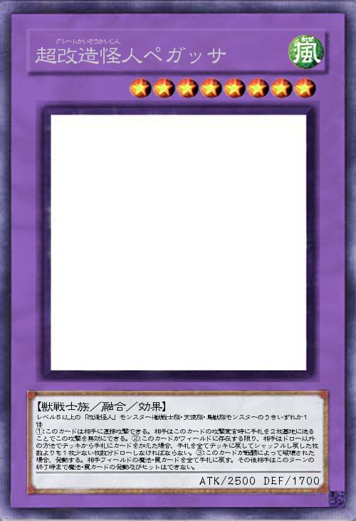 | レベル5以上の「改造怪人」モンスター+獣戦士族・天使族・鳥獣族モンスターのうちいずれか1体 ①:このカードは相手に直接攻撃できる。相手はこのカードの攻撃宣言時に手札を2枚墓地に送ることでこの攻撃を無効にできる。②:このカードがフィールドに存在する限り、相手はドロー以外の方法でデッキから手札にカードを加えた場合、手札を全てデッキに戻してシャッフルし戻した枚数よりも1枚少ない枚数分ドローしなければならない。③:このカードが戦闘によって破壊された場合、発動する。相手フィールドの魔法・罠カードを全て手札に戻す。その後相手はこのターンの終了時まで魔法・罠カードの発動及びセットはできない。 | |||