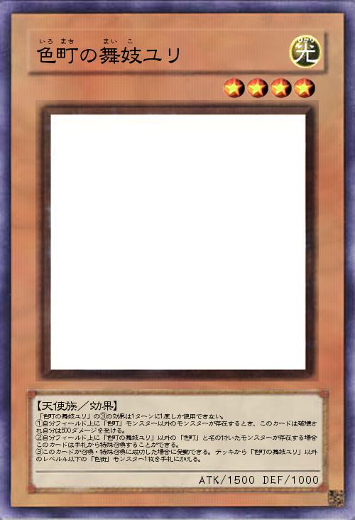 | 「色町の舞妓ユリ」の③の効果は1ターンに1度しか使用できない。 ①自分フィールド上に「色町」モンスター以外のモンスターが存在するとき、このカードは破壊され自分は500ダメージを受ける。 ②自分フィールド上に「色町の舞妓ユリ」以外の「色町」と名の付いたモンスターが存在する場合このカードは手札から特殊召喚することができる。 ③このカードが召喚・特殊召喚に成功した場合に発動できる。デッキから「色町の舞妓ユリ」以外のレベル4以下の「色街」モンスター1枚を手札に加える。 | |||