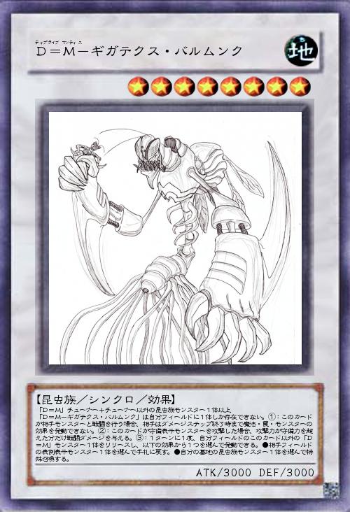 | 「D=M」チューナー+チューナー以外の昆虫族モンスター1体以上 「D=M-ギガテクス・バルムンク」は自分フィールドに1体しか存在できない。①:このカードが相手モンスターと戦闘を行う場合、相手はダメージステップ終了時まで魔法・罠・モンスターの効果を発動できない。②:このカードが守備表示モンスターを攻撃した場合、攻撃力が守備力を超えた分だけ戦闘ダメージを与える。③:1ターンに1度、自分フィールドのこのカード以外の「D=M」モンスター1体をリリースし、以下の効果から1つを選んで発動できる。●相手フィールドの表側表示モンスター1体を選んで手札に戻す。●自分の墓地の昆虫族モンスター1体を選んで特殊召喚する。 | |||