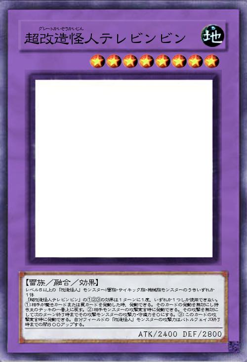 | レベル5以上の「改造怪人」モンスター+雷族・サイキック族・機械族モンスターのうちいずれか1体 「超改造怪人テレビンビン」の①②③の効果は1ターンに1度、いずれか1つしか使用できない。①:相手が魔法カードまたは罠カードを発動した時、発動できる。そのカードの発動を無効にし持ち主のデッキの一番上に戻す。②:相手モンスターの攻撃宣言時に発動できる。その攻撃を無効にして次のターン終了時までその攻撃モンスターの攻撃力・守備力を0にする。③:このカードの攻撃宣言時に発動できる。自分フィールドの「改造怪人」モンスターの攻撃力はバトルフェイズ終了時までの間800アップする。 | |||