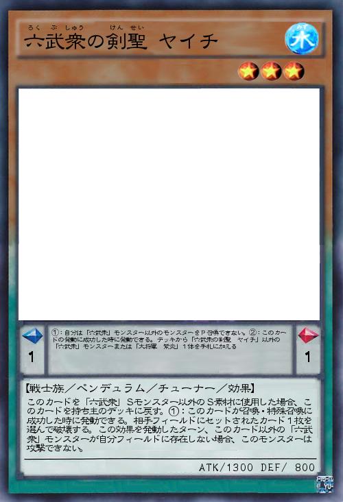| このカードを「六武衆」Sモンスター以外のS素材に使用した場合、このカードを持ち主のデッキに戻す。①:このカードが召喚・特殊召喚に成功した時に発動できる。相手フィールドにセットされたカード1枚を選んで破壊する。この効果を発動したターン、このカード以外の「六武衆」モンスターが自分フィールドに存在しない場合、このモンスターは攻撃できない。 | |||