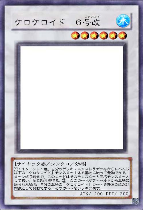 暫定的ですが、効果に「自分は「ケロケロイド 6号改」を1ターンに1度しか特殊召喚できない。」を追加します。」(2015-11-07 11:17)