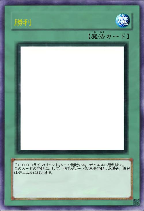 | 30000ライフポイント払って発動する。デュエルに勝利する。 このカードの発動に対して、相手がカード効果を発動した場合、自分はデュエルに敗北する。 | |||