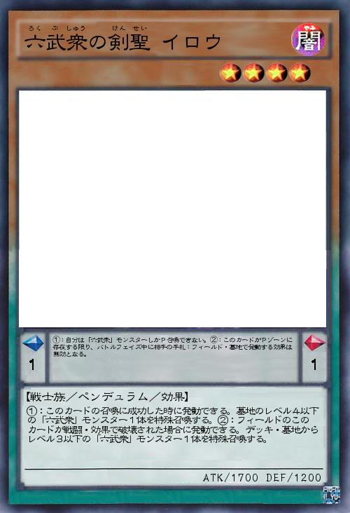 | ①:このカードの召喚に成功した時に発動できる。墓地のレベル4以下の「六武衆」モンスター1体を特殊召喚する。②:フィールドのこの カードが戦闘・効果で破壊された場合に発動できる。デッキ・墓地からレベル3以下の「六武衆」モンスター1体を特殊召喚する。 | |||