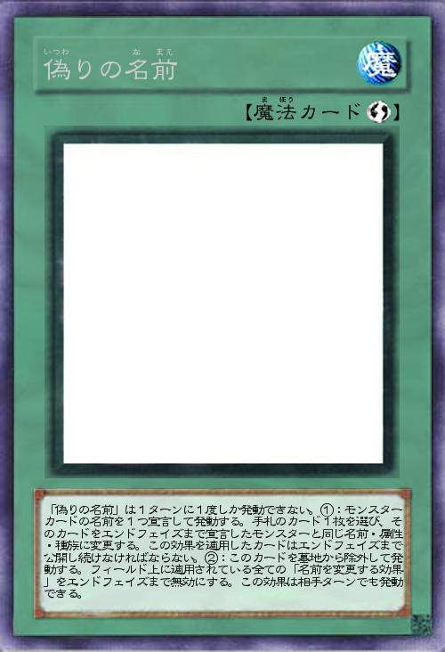 | 「偽りの名前」は1ターンに1度しか発動できない。①:モンスターカードの名前を1つ宣言して発動する。手札のカード1枚を選び、そのカードをエンドフェイズまで宣言したモンスターと同じ名前・属性・種族に変更する。この効果を適用したカードはエンドフェイズまで公開し続けなければならない。②:このカードを墓地から除外して発動する。フィールド上に適用されている全ての「名前を変更する効果」をエンドフェイズまで無効にする。この効果は相手ターンでも発動できる。 | |||