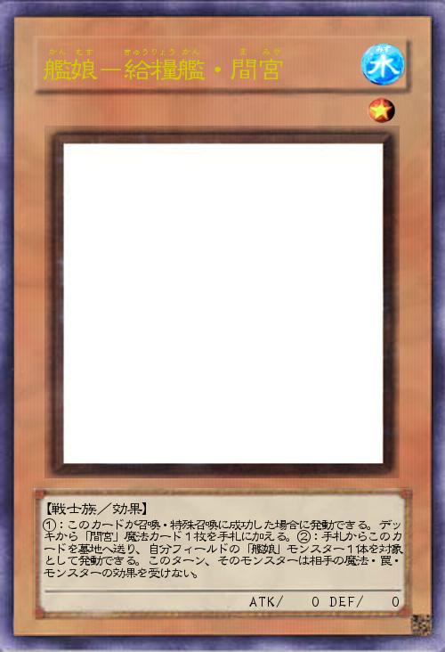 | ①:このカードが召喚・特殊召喚に成功した場合に発動できる。デッキから「間宮」魔法カード1枚を手札に加える。②:手札からこのカードを墓地へ送り、自分フィールドの「艦娘」モンスター1体を対象として発動できる。このターン、そのモンスターは相手の魔法・罠・モンスターの効果を受けない。 | |||