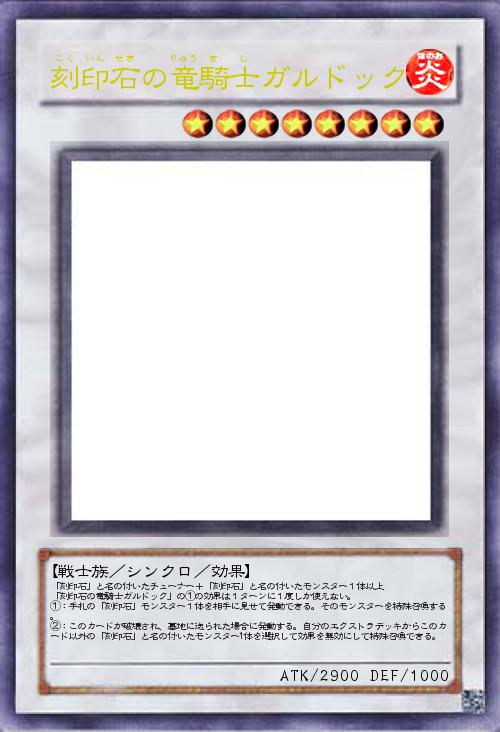 | 「刻印石」と名の付いたチューナー+「刻印石」と名の付いたモンスター1体以上 「刻印石の竜騎士ガルドック」の①の効果は1ターンに1度しか使えない。 ①:手札の「刻印石」モンスター1体を相手に見せて発動できる。そのモンスターを特殊召喚する。 ②:このカードが破壊され、墓地に送られた場合に発動する。自分のエクストラデッキからこのカード以外の「刻印石」と名の付いたモンスター1体を選択して効果を無効にして特殊召喚できる。 | |||