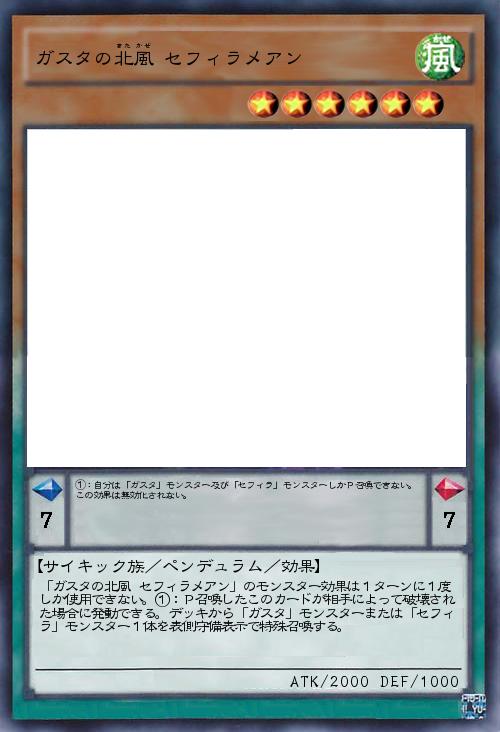| 「ガスタの北風 セフィラメアン」のモンスター効果は1ターンに1度しか使用できない。①:P召喚したこのカードが相手によって破壊された場合に発動できる。デッキから「ガスタ」モンスターまたは「セフィラ」モンスター1体を表側守備表示で特殊召喚する。 | |||