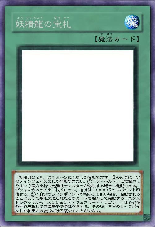 | 「妖精龍の宝札」は1ターンに1度しか発動できず、②の効果は自分のメインフェイズにしか発動できない。①:フィールド上に攻撃力より高い守備力を持つ光属性モンスターが存在する場合に発動できる。デッキからカードを1枚ドローし、自分は1000ライフポイント回復する。②:自分のライフポイントが相手より低い場合、発動されることによって墓地に送られたこのカードを除外して発動する。エクストラデッキから「エンシェント・フェアリー・ドラゴン」1体を召喚条件を無視して守備表示で特殊召喚する。その後、自分のライフポイントを相手との差分だけ回復することができる。 | |||