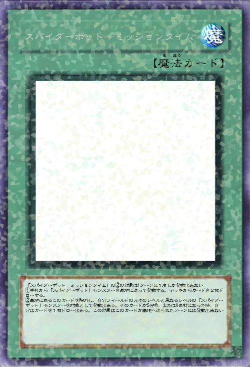 | 「スパイダーボット―ミッションタイム」の②の効果は1ターンに1度しか発動出来ない ①手札から「スパイダーボット」モンスターを墓地に送って発動する。デッキからカードを2枚ドローする。 ②墓地にあるこのカードを除外し、自分フィールドの元々のレベルと異なるレベルの「スパイダーボット」モンスターを対象として発動出来る。そのカードがS召喚、またはX素材になった時、自分はカードを1枚ドロー出来る。この効果はこのカードが墓地へ送られたターンには発動出来ない | |||