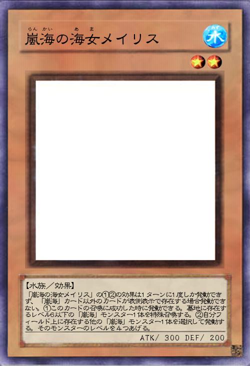 | 「嵐海の海女メイリス」の①②の効果は1ターンに1度しか発動できず、「嵐海」カード以外のカードが表側表示で存在する場合発動できない。①このカードの召喚に成功した時に発動できる。墓地に存在するレベル6以下の「嵐海」モンスター1体を特殊召喚する。②自分フィールド上に存在する他の「嵐海」モンスター1体を選択して発動する。そのモンスターのレベルを4つあげる。 | |||