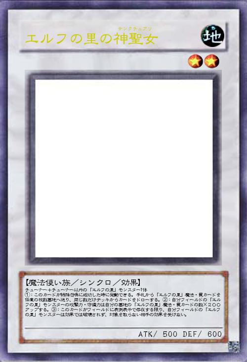 | チューナー+チューナー以外の「エルフの里」モンスター1体 ①:このカードが特殊召喚に成功した時に発動できる。手札から「エルフの里」魔法・罠カードを任意の枚数墓地へ送り、同じ数だけデッキからカードをドローする。②:自分フィールドの「エルフの里」モンスターの攻撃力・守備力は自分の墓地の「エルフの里」魔法・罠カードの数×200アップする。③:このカードがフィールドに表側表示で存在する限り、自分フィールドの「エルフの里」モンスターは効果では破壊されず、対象を取らない相手の効果を受けない。 | |||