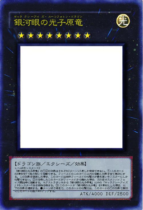 | レベル8モンスター×2 「銀河眼の光子原竜」の①②の効果はそれぞれ1ターンに1度しか使用できない。①:このカードのX素材を1つ取り除いて発動できる。フィールドのこのカード以外の発動と効果を全て無効にする。この効果を使用した場合、このカードは相手フィールドの攻撃力が最も高いモンスターにしか攻撃できない。②:X召喚したこのカードがフィールドから離れた場合、次の自分スタンバイフェイズ開始時に発動する。エクストラデッキから「銀河眼の光子原竜」以外の「ギャラクシーアイズ」Xモンスター1体を特殊召喚する。③:このカードが「銀河眼の光子竜」をX素材とした場合、以下の効果を適用する。●ターン終了時まで、このカードの攻撃力は、このカードの①の効果で無効にしたカードの数×400アップする。 | |||