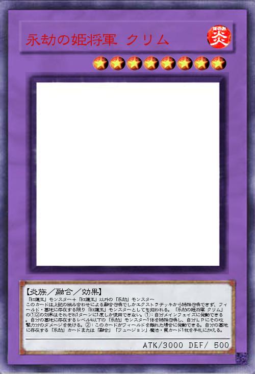 | 「紅蓮王」モンスター+「紅蓮王」以外の「永劫」モンスター このカードは上記の組み合わせによる融合召喚でしかエクストラデッキから特殊召喚できず、フィールド・墓地に存在する限り「紅蓮王」モンスターとしても扱われる。「永劫の姫将軍 クリム」の①②の効果はそれぞれ1ターンに1度しか使用できない。①:自分メインフェイズに発動できる。自分の墓地に存在するレベル4以下の「永劫」モンスター1体を特殊召喚し、自分LPにその攻撃力分のダメージを受ける。②:このカードがフィールドを離れた場合に発動できる。自分の墓地に存在する「永劫」カードまたは「融合」「フュージョン」魔法・罠カード1枚を手札に加える。 | |||