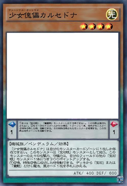 | 「少女傀儡カルセドナ」は自分のモンスターカードゾーンに1枚しか存在できない。このモンスターは「宝石眼」モンスターとして扱う。このモンスターの元々の攻撃力、守備力は、自分のフィールドの他の「宝石眼」モンスター1体につき300ポイントアップする。 ①召喚、特殊召喚に成功した時発動できる。デッキから「宝石」または「貴覯」と付く魔法、罠カード1枚を手札に加える。 | |||