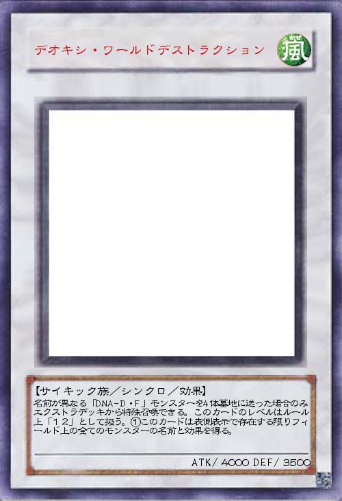 | 名前が異なる「DNA-D・F」モンスターを4体墓地に送った場合のみエクストラデッキから特殊召喚できる。このカードのレベルはルール上「12」として扱う。①このカードは表側表示で存在する限りフィールド上の全てのモンスターの名前と効果を得る。 | |||
