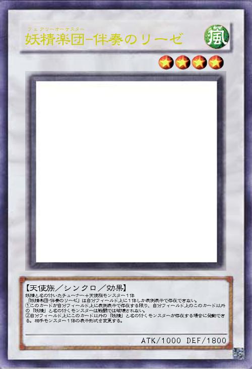 | 妖精と名の付いたチューナー+天使族モンスター1体 「妖精楽団-伴奏のリーゼ」は自分フィールド上に1体しか表側表示で存在できない。 ①このカードが自分フィールド上に表側表示で存在する限り、自分フィールド上のこのカード以外の「妖精」と名の付くモンスターは戦闘では破壊されない。 ②自分フィールド上にこのカード以外の「妖精」と名の付くモンスターが存在する場合に発動できる。相手モンスター1体の表示形式を変更する。 | |||