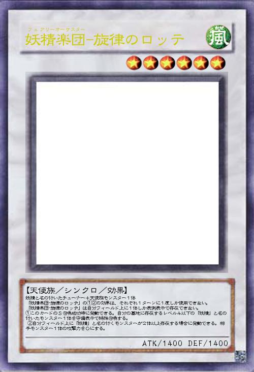 | 妖精と名の付いたチューナー+天使族モンスター1体 「妖精楽団-旋律のロッテ」の①②の効果は、それぞれ1ターンに1度しか使用できない。 「妖精楽団-旋律のロッテ」は自分フィールド上に1体しか表側表示で存在できない。 ①このカードのS召喚成功時に発動できる。自分の墓地に存在するレベル4以下の「妖精」と名の付いたモンスター1体を守備表示で特殊召喚する。 ②自分フィールド上に「妖精」と名の付くモンスターが2体以上存在する場合に発動できる。相手モンスター1体の攻撃力を0にする。 | |||