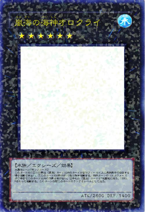 | 水属性レベル6モンスター×2 このカードの①②の効果は「嵐海」カード以外のカードが自分フィールド上に表側表示で存在する場合発動できない。①このカードのX素材を1つ取り除き発動する。相手ターンのバトルフェイズ終了時までこのカード以外の効果を受けない。②手札の「嵐海」カードを1枚墓地に送り、1000LPを払って発動する。このターンの間このカードのランクをレベルとして扱う。 | |||