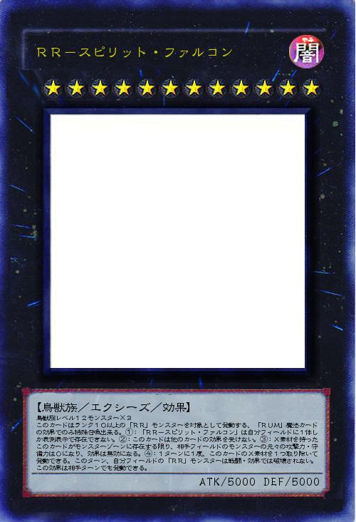 | 鳥獣族レベル12モンスター×3 このカードはランク10以上の「RR」モンスターを対象として発動する、「RUM」魔法カードの効果でのみ特殊召喚出来る。①:「RR-スピリット・ファルコン」は自分フィールドに1体しか表側表示で存在できない。②:このカードは他のカードの効果を受けない。③:X素材を持ったこのカードがモンスターゾーンに存在する限り、相手フィールドのモンスターの元々の攻撃力・守備力は0になり、効果は無効になる。④:1ターンに1度、このカードのX素材を1つ取り除いて発動できる。このターン、自分フィールドの「RR」モンスターは戦闘・効果では破壊されない。この効果は相手ターンでも発動できる。 | |||