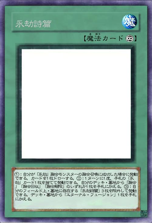 | ①:自分が「永劫」融合モンスターの融合召喚に成功した場合に発動できる。カードを1枚ドローする。②:1ターンに1度、手札の「永劫」カード1枚を捨てて発動できる。自分のデッキ・墓地から「融合」「融合回収」「融合解除」のいずれか1枚を手札に加える。③:自分のフィールド上・墓地に存在する「永劫詩篇」3枚を除外して発動できる。デッキ・墓地から「エターナル・フュージョン」1枚を手札に加える。 | |||
