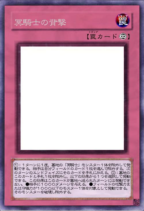 | ①:1ターンに1度、墓地の「冥騎士」モンスター1体を除外して発動できる。相手は自分フィールドのカード1枚を選んで除外する。次のターンのエンドフェイズにそのカードを手札に加える。②:墓地のこのカードと手札1枚を除外し、以下の効果から1つを選択して発動できる。この効果はこのカードが墓地へ送られたターンには発動できない。●相手に1000ダメージを与える。●フィールドの攻撃力または守備力が1000以下のモスター1体を対象として発動できる。そのモンスターを破壊し除外する。 | |||