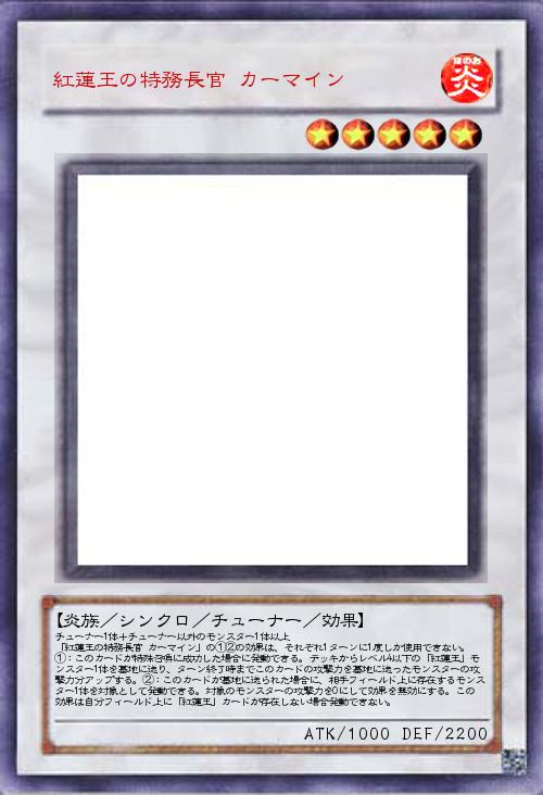 | チューナー1体+チューナー以外のモンスター1体以上 「紅蓮王の特務長官 カーマイン」の①②の効果は、それぞれ1ターンに1度しか使用できない。①:このカードが特殊召喚に成功した場合に発動できる。デッキからレベル4以下の「紅蓮王」モンスター1体を墓地に送り、ターン終了時までこのカードの攻撃力を墓地に送ったモンスターの攻撃力分アップする。②:このカードが墓地に送られた場合に、相手フィールド上に存在するモンスター1体を対象として発動できる。対象のモンスターの攻撃力を0にして効果を無効にする。この効果は自分フィールド上に「紅蓮王」カードが存在しない場合発動できない。 | |||